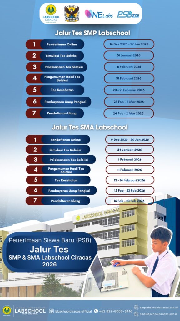 Siap bergabung dengan SMP Labschool Ciracas? Proses pendaftaran kami dirancang sederhana dan mudah. Kunjungi halaman pendaftaran di situs kami untuk informasi lengkap mengenai langkah-langkah pendaftaran, persyaratan, dan dokumen yang diperlukan. Kami akan selalu mendampingi Anda dalam proses ini, memastikan semuanya berjalan lancar. Masa depan dimulai dari sini!